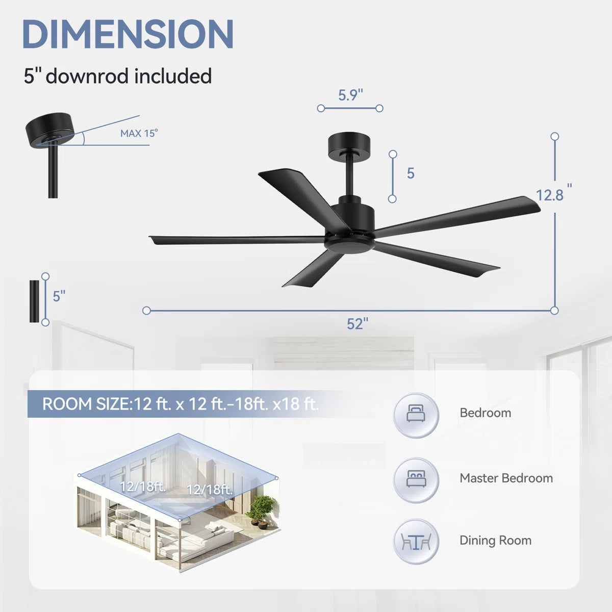 - Dual-Mount Hanging Options: Includes 5 inch downrod to ensure proper ceiling clearance and optimize airflow.